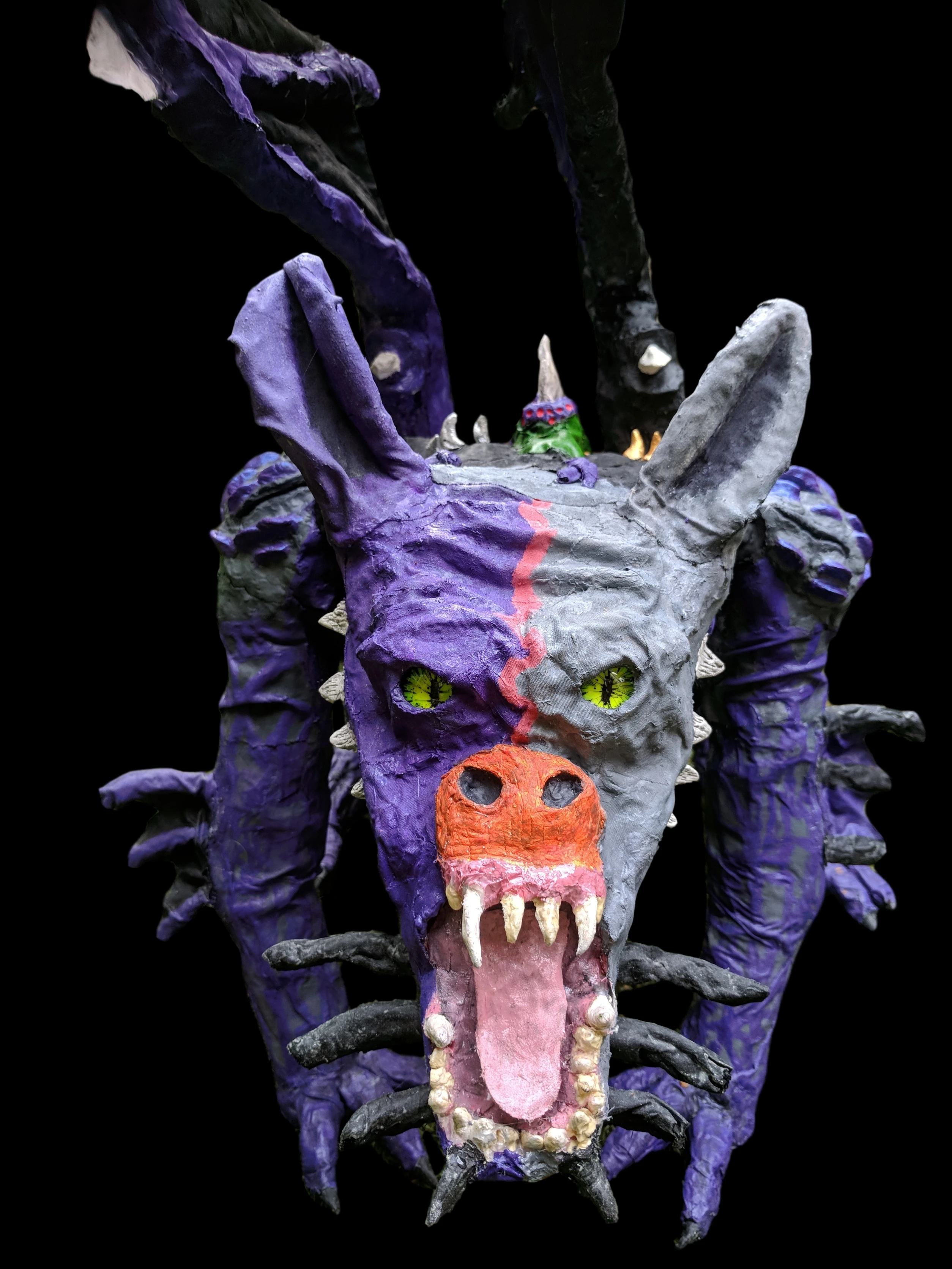 Chupacabra-Gargoyle Hybrid (mixed media): This 1.23m long sculpture glows in the dark green and red and is a combination of chupacabra and a gargoyle. Also my journey or process of making this sculpture is published on 'vocal.media' as mentioned and linked under my 'CV' page 'Publications'. Created with a varitey of mediums including air dry clay, paper mache, fur fabric, cloth (old bedsheets), acrylic paint and glass eyes.